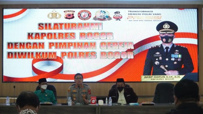 Buser86.com // Bogor – Berlokasi di Aula Sanika Satyawada Polres Bogor, Kapolres Bogor AKBP Harun S I.K.,S.H gelar silahturahmi bersama dengan para pimpinan Gereja Sekabupaten. ( 12/12)
