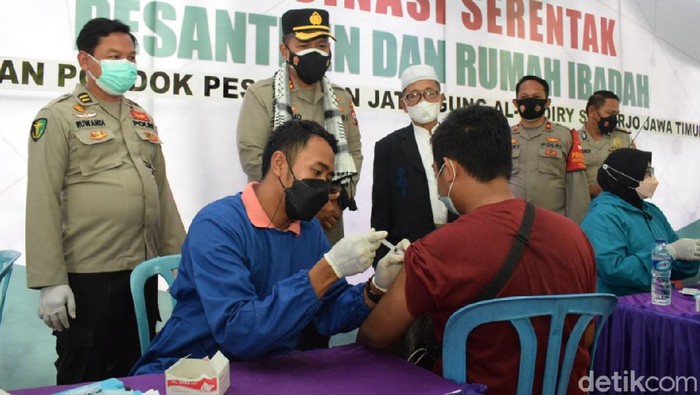 Sidoarjo -Polisi di Sidoarjo kembali menggenjot vaksinasi kepada seribu santri di Sidoarjo. Kegiatan ini dilakukan untuk mempercepat pelaksanaan pembelajaran tatap muka (PTM) di kalangan pondok dan rumah ibadah.