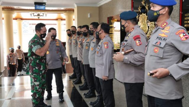 “Baru saja kami bersama pejabat utama Mabes Polri menerima Pak Panglima TNI yang baru, tentunya banyak hal yang kita diskusikan bagaimana beberapa hal yang akan kita tingkatkan ke depan seperti sinergitas soliditas TNI-Polri,” ujar Kapolri.